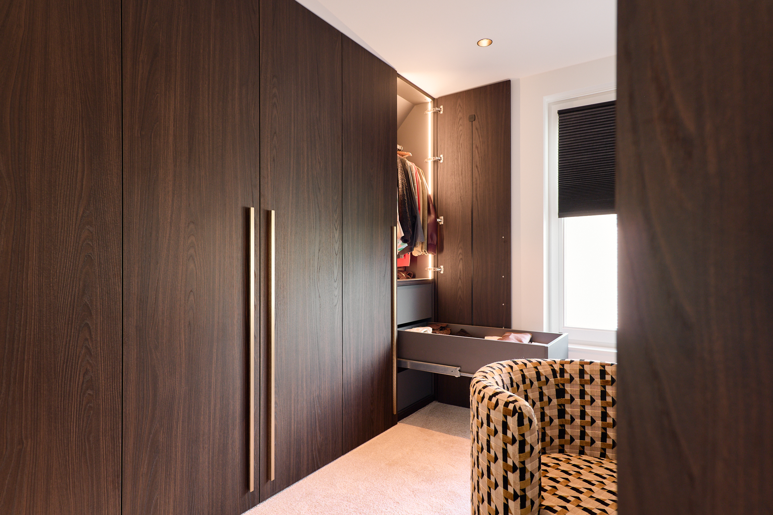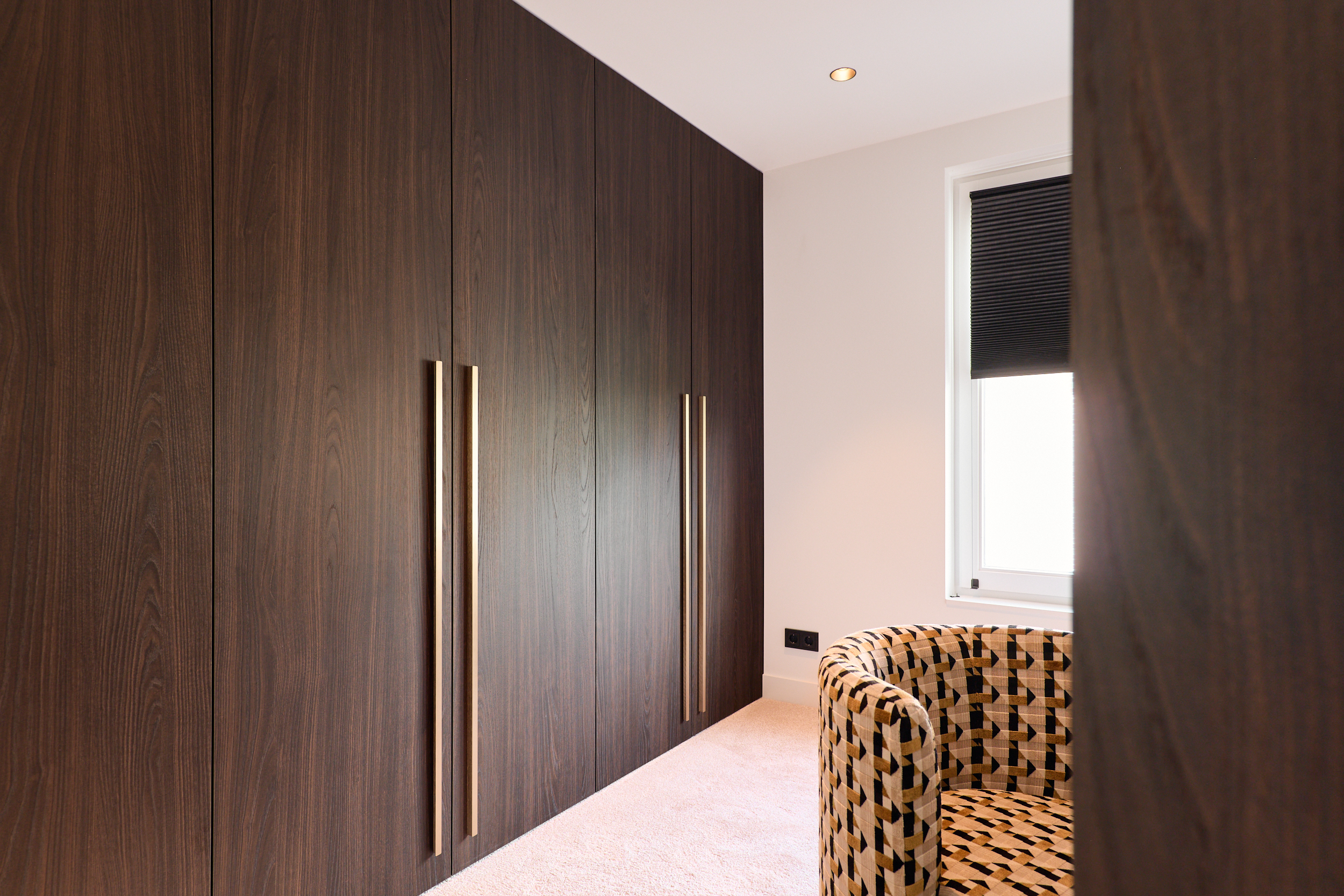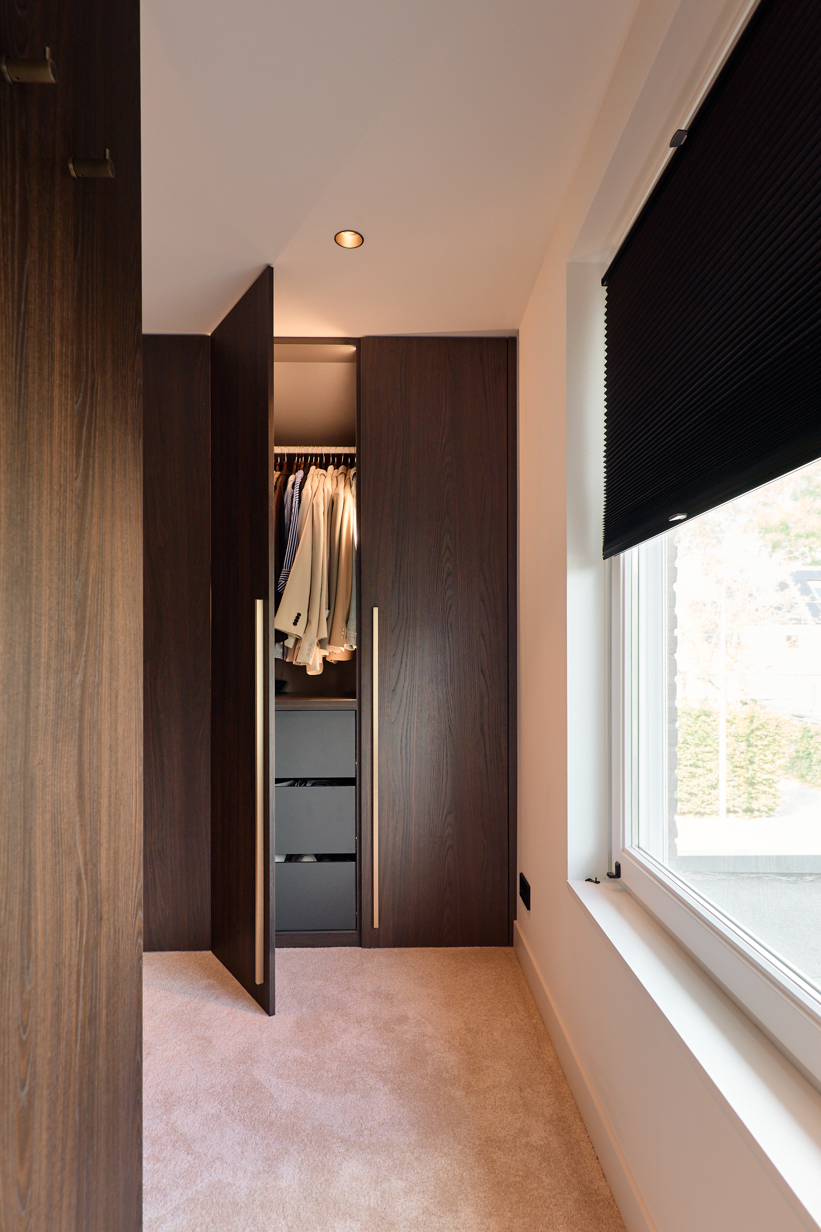 Donker, chic & doordachtDeze kast in donker houtfineer straalt luxe uit, met messingkleurige grepen en geïntegreerde kledingliften en lades. Alles op maat voor een elegante en praktische inloopkast.